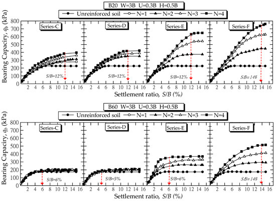 Figure 12 shows the relationship between the simulated q and S/B of B20, B60 and B100 with the four configurations (Series C, D, E and F). For all cases, the q initially increased with the increase of S/B ratio up to a particular S/Bf. When S/B > S/Bf, the q value was slightly increased, and it can be assumed as achieving the failure state. For Series C, D and E, the S/Bf = 12, 8, 6, 5, and 5% for B20, B40, B60, B80 and B100, respectively, for N = 1–4. The q for Series F was fully developed at the S/Bf = 14% for N = 1 to 4. It was evident that the development of q in Series F was the highest when compared with other Series. The development of qb depended on not only the types of tested soil, but also the reinforcing techniques (planar and wraparound ends), which will be discussed in the next section.