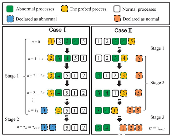 In Case II, the decision-maker chooses the method of excluding normal processes to locate the L abnormal processes with lower expected cumulative costs. Let denote the set of processes whose states have been declared as normal at time n. Thus, the selection rule , stopping rule and decision rule are given by