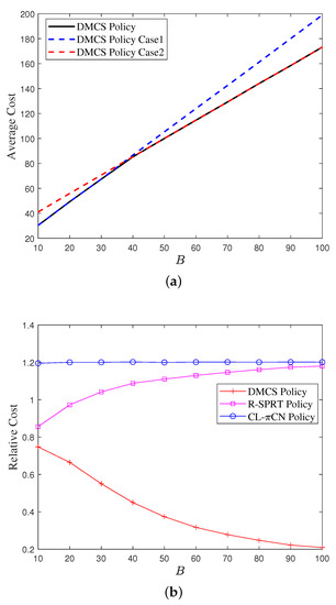 Note that B is the threshold relative to the error probability and determines the expected sample size required to declared the state of processes, where the expected sample size is for the abnormal processes and is for the normal processes. Based on (22) and (23), the ratio of s to B can find a connection with the ratio of the cumulative switching cost to the cumulative observation cost.