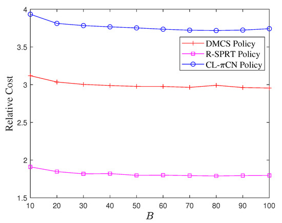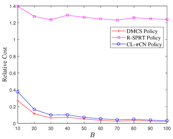 In Scenario 2 where as . As shown in Figure 4, the DMSC policy outperforms the CL- policy but underperforms the R-SPRT policy. In this scenario, the ratio s is sufficiently large such the cost incurred by an additional switch will be higher than the cost of observing and declaring a non-target process. Since switching occurs only when the state of a process is identified, the switching times of R-SPRT are the smallest among any other policy. In this case, the R-SPRT performs better benefiting from the fewer switching times. Meanwhile, the switching cost of the DMSC policy is much higher than that of R-SPRT, making the performance on the expected cumulative cost inferior. As for the CL- policy, the switching cost is much higher than that of DMSC policy, thus its relative cost is highest among these three algorithms. Besides, the DMSC is order-optimal in terms of the expected cumulative cost in the scenario where as .
