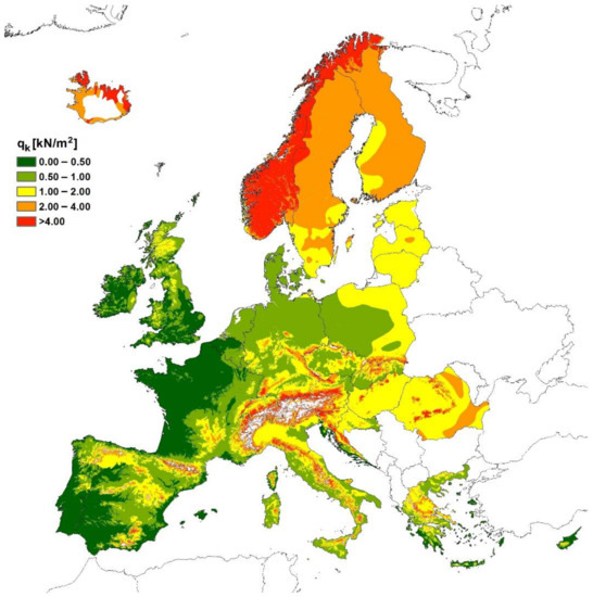- Croce, P.; Formichi, P.; Landi, F.; Marsili, F. Harmonized European ground snow load map: Analysis and comparison of national provisions. Cold Reg. Sci. Technol. 2019, 168, 102875. [Google Scholar] [CrossRef]