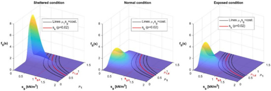 Joint probability density function (pdf) of ground snow load () and shape coefficient () for flat roofs (Lodi weather station) under different exposure conditions (black curves represent a constant roof load (), while the red curve corresponds to ).