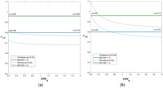Design shape coefficient for flat roofs () as a function of the coefficient of variation of ground snow load (), parameterized in terms of exposure conditions (sheltered: green lines, normal: blue lines). (a) Norwegian database; (b) Norwegian database assuming .