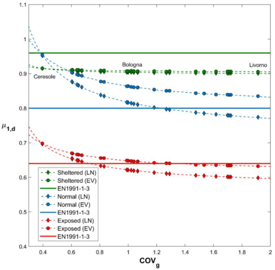 Design shape coefficient for flat roofs () as a function of the coefficient of variation () of ground snow load, parameterized in terms of exposure conditions (sheltered: green lines, normal: blue lines, exposed: red lines) and distribution of the snow load on ground (log-normal: circular markers, Gumbel: lozenge markers) for 25 Italian weather stations.