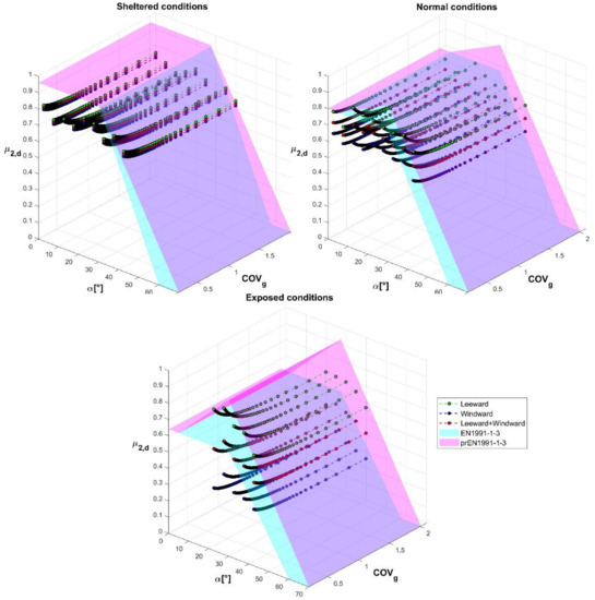 These issues have been resolved with the new model proposed in prEN1991-1-3 [17], which is generally conservative for all exposure conditions and pitch angles, except for normal and sheltered conditions in the case where (see Figure 10), where it leads to slightly unconservative predictions.