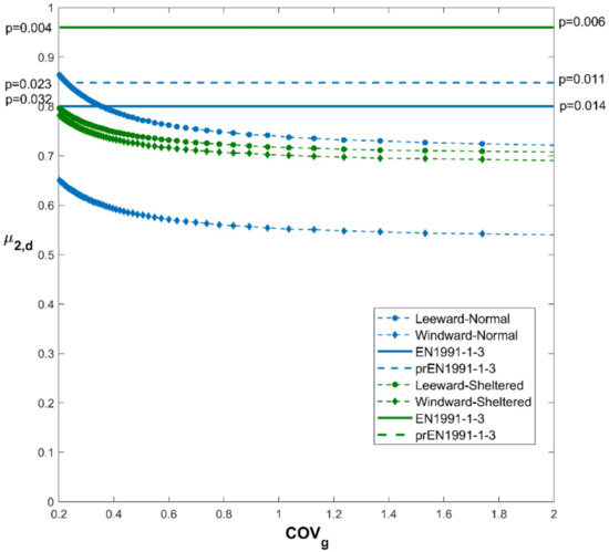 Moreover, considering the Norwegian database [16,24,25], where snow load on roofs is usually characterized by low values of the coefficient of variation (see Table 2), different outcomes are obtained for flat roofs (see Figure 5a). In fact, in that case, the design shape coefficients determined using the Eurocode approach are conservative both for sheltered () and normal exposure (), while no data are available for exposed conditions.