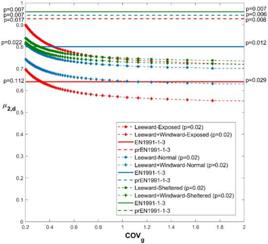 Design values of shape coefficients of flat roofs () are illustrated in Figure 4 as a function of the coefficient of variation of the annual maxima of ground snow load (). In the diagram, where each dashed curve corresponds to a specific exposure condition (the green curve to the sheltered condition, the blue curve to normal condition, and the red curve to the exposed condition), the analogous, green, blue, and red, horizontal solid lines corresponding to the constant values of the provided in EN1991-1-3:2003 have also been reported. These have been kept unchanged in the prEN1991-1-3:2020. The considered range of , , has been chosen to cover all the values that can be realistically expected in Europe (see Section 2.1).