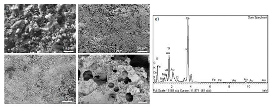 SEM micrographs ((a–d), at increasing enlargements) and EDX analysis of the monolith (e).