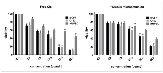 The cytotoxic activity of standard and encapsulated Cis were measured in malignant MCF7 and C152 cells compared to normal HUVECs. All three cell lines were treated with 0 to 40 µg/mL free Cis and F127/Cis microemulsions for 48 h. Figure 1 demonstrates the viability of the cells upon exposure to both agents as a function of concentration. Compared with untreated cells, free Cis significantly decreased the viability of MCF7 and C152 cells in a concentration-dependent manner (p < 0.05). The same pattern, but to a lesser extent, was observed when HUVECs were treated with increasing concentrations of free Cis. IC50 values for 48 h treatment of C152, HUVEC, and MCF7 cells with free Cis were 6.01, 22.42, and 6.81 μg/mL, respectively, while these values were 13.75 μg/mL (for C152 cells), 14.68 μg/mL (for MCF7 cells), and 24.27 μg/mL (for HUVECs) when exposed to F127/Cis microemulsions. Between the examined cell lines, C152 cells were the most susceptible to free- and encapsulated Cis.