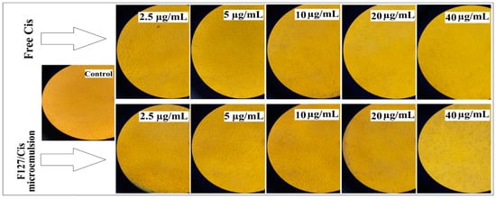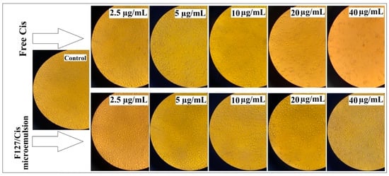 Figure 2. C152 cells exposed to 0 to 40 µg/mL of free Cis or F127/Cis microemulsions for 48 h. Morphological changes of cells were visualized by invert microscopy at 20× magnification and imaged using a digital camera.