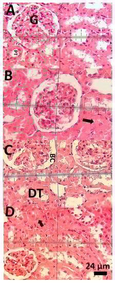 Photomicrographs of the kidney of the control group showed normal glomerulus and normal proximal tubules (Figure 4A). Photomicrographs of the kidney of rats treated with the bulk form of Cis (7 mg/kg) showed narrowing of proximal tubules (Figure 4B). Rats treated with F127/Cis microemulsion (7 mg/kg) had normal Bowman’s capsule and normal distal tubules (Figure 4C). Light micrograph of a kidney of rats treated with 14 mg/kg of F127/Cis microemulsion showed swelling of proximal tubules (Figure 4D).