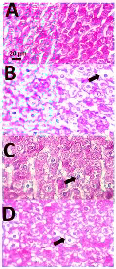 Liver sections of the control group had normal hepatocytes and normal hepatic architecture (Figure 5A). Photomicrographs of the liver of rats treated with the bulk form of Cis (7 mg/kg) showed nuclear pyknosis (Figure 5B). In the liver of rats treated with F127/Cis microemulsion (7 mg/kg), there were normal hepatic sinusoids and mild perinuclear lipid accumulation (Figure 5C). Light micrographs of the liver of rats treated with 14 mg/kg of F127/Cis microemulsion showed severe fatty change (Figure 5D).