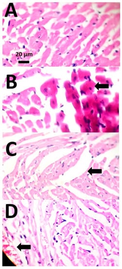 Figure 6. (A) A heart section of a control rat with normal architecture. (B) Heart section of a rat treated with a bulk form of Cis (7 mg/kg); arrow shows necrosis. (C) Photomicrograph of a rat treated with F127/Cis microemulsion (7 mg/kg) with normal heart structure and mild disarrangement of filamentous arrays (arrow). (D) Heart section of a rat treated with 14 mg/kg of F127/Cis microemulsion showing congestion in heart tissue (arrow). (Alcian blue stain. Mic. Mag. × 40).