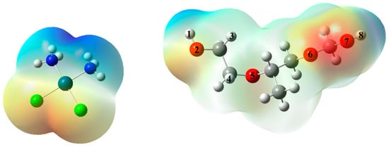 We depicted a Molecular Electrostatic Potential (MEP) map of a unit of the polymeric chain of F127 to study the interactions of Cis with surfactant. This map helps to find electron-rich positions that are capable of hydrogen bonding (HB) interactions with Cis. As displayed in Figure 7, red positions are located on atoms O2, O6, and O7 of F127. Thus, we focused on these positions for HB interactions with Cis. Binary complexes formed via HB interactions of Cis with atoms O2, O6, and O7 of F127 are named A, B, and C. Results show that ammonia groups of Cis have more tendencies for HB interactions with F127 than chlorine atoms. In fact, we surveyed HB interactions between chlorine atoms of Cis and F127, but no stable complex was formed.