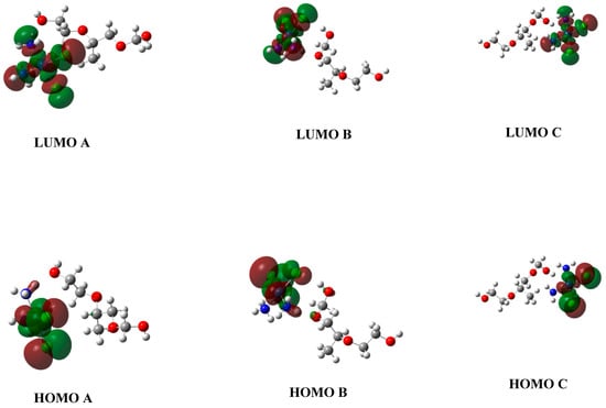As can be seen, the EG value of free F127 is higher than the complexes. Results indicate that a decrease of HOMO and LUMO energies is followed by the increase of the HB strength of the complexes. The lowest EHOMO and ELUMO values correspond to complex B, with the largest binding energy value. Therefore, we have represented the distribution of HOMO and LUMO on the complexes in Figure 8. As can be observed, HOMO lays on Cis in all complexes, and there is only an extension on atom O6 of F127 in complex B. Moreover, the distribution of HOMO on complex B has more π character in comparison to other complexes. As said, this complex has the largest binding energy among other complexes. It seems that this distribution of HOMO, which refers to division of electron charges, has an effect on the formation of stable complex B via HB interaction between Cis and atom O6 of F127.