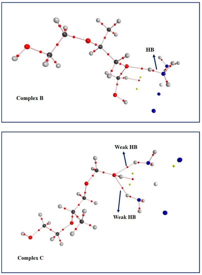 Topological properties of the complexes have been planned by the AIM method. The molecular graphs involving bond critical points (BCPs) and bond paths are shown in Figure 9. As can be observed, there are two weak HB interactions (C–H···Cl) in complex A. The electron charge density values at BCPs of these interactions (ρBCP) are 2.89 × 10−3 and 7.50 × 10−3 au. The ρBCP value at the main HB is 3.93 × 10−2 au. Additionally, there are two weak HB interactions in complex C due to tendencies of both ammonia groups of Cis to atom O7 of F127. The ρBCP values related to these interactions are 1.69 × 10−2 and 1.57 × 10−2 au. However, interaction in complex B does not include any weak HB, and this complex has the larger binding energy. The ρBCP value at HB interaction of this complex is 4.35 × 10−2 au. Hence, it can be suggested that the magnitudes of ρBCP values directly influence the complexes’ stability.