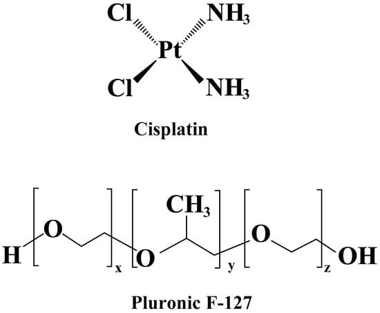 Several factors must be considered, such as selected oil, surfactant, and co-surfactant to optimize the drug encapsulation. In microemulsions, surfactants minimize the hydrophobic interactions between the phases to maintain stability [14]. The microemulsions composed of non-ionic surfactants hold technological versatility as such nanosystems offer stability and protection to the entrapped drug from the tumor or cancer microenvironment, along with physiological conditions of the body [15]. Moreover, their use in pharmaceutical formulations has been approved by the regulatory authorities [16]. Pluronics are triblock copolymers with the general structure (polyethylene glycol)-block-(polypropylene glycol)-block-(polyethylene glycol). Pluronic F127 is a non-ionic surfactant with amphiphilic properties and is widely used in the development of microemulsions because of its biocompatibility and pronounced effect on the sustained release of drugs [17]. The use of F127 significantly improves the colloidal stability as compared to conventional ionic surfactants [18,19].The molecular structures of cisplatin and F127 are shown in Scheme 1.