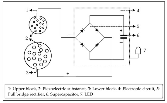 Vibrations are quite typical in energy harvesting. The piezoelectric energy harvester is naturally capable of transforming mechanical energy, such as vibrations, into electrical energy [21,22]. Various piezoelectric energy harvesters have been developed [23,24,25]. Piezoelectric energy harvesters are quite appropriate for portability, and thus for environmentally friendly (eco-friendly) applications. Therefore, the proposed system uses a piezoelectric energy harvester. It is simply composed of piezoelectric blocks, a full-wave bridge rectifier, and a supercapacitor. This structure can also be evaluated by using more complex electronic components such as over-voltage protection circuit, IC full-wave bridge rectifier, filters, etc. However, the presented version of the electrical system is quite functional and available.