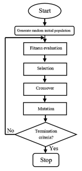 Genetic Algorithm (GA) is utilized in optimizations. GA simply focuses on minimizing the OF with the constraints of the input parameters [39]. GA optimization has a process flow as shown in Figure 5. The first step is the generation of initial populations. Initial populations (chromosomes) are selected randomly depending on the constraints. The second step is fitness evaluation where the OF is evaluated using each chromosome, and results are scaled. Then, the evaluated chromosomes are selected to create the new generation regarding their fitness performance. There are a few selection methods available, and the stochastic uniform selection is utilized in this study. It provides diversity in the population and so it prevents inadequate preterm convergence [40]. Next, the crossover process begins following the selection of fittest parent chromosomes. The crossover is employed to interchange some of chromosomes to create a new-generation offspring. Finally, mutation starts to change chromosomes randomly. Both the crossover and the mutation are executed with regards to the constraints of the parameters. All processes are executed repeatedly until the targeted termination criteria. In the optimization process, MATLAB 2020a Global Optimization Tool is used. GA optimization parameters are presented in Table 4.