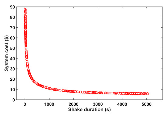 It should be noted that the piezoelectric harvester generates 42.19 of electrical energy within a shaking duration of 15.34 . Then, the stored energy is dissipated by the UV-LEDs within 27.9 to achieve the target disinfection performance. This optimal set of parameters may give an idea of the cost of the system. However, it would be better to optimize the cost and shake duration together. Next, multiple-objective optimization is applied by including the cost of the system. In this case, both objective functions (the shake duration and the cost) need to be solved together. Therefore, the shake duration and the cost are considered as the main criteria for the cost scenarios. Having considered various user expectations as well as the variability of the component cost in the market, there may be three different cost scenarios (low, typical or moderate, high). By inspecting the range of the cost and the shake duration, it is found that there are 175 different pairs of cost and shake duration. Among these pairs, a threshold value for the cost is determined for the low, moderate and high scenarios, respectively. More specifically, the low-cost scenario corresponds to the pairs with the lowest cost and the highest shake duration, whereas the high-cost scenario corresponds to the pairs with the lowest cost and the lowest shake duration. Besides, the moderate cost scenario corresponds to the mean value of the costs. The multi-objective GA optimization is shown in Figure 7 where all these pairs are considered. Then, the optimal values of the design parameters are derived as listed in Table 6. It should be noted that both the shake duration and the cost ranges present variability, and extreme values might indicate lower and upper parametric bounds. For more applicable values in between the extreme values, some more parameters need to be considered, and further fine-tuning would be possible.