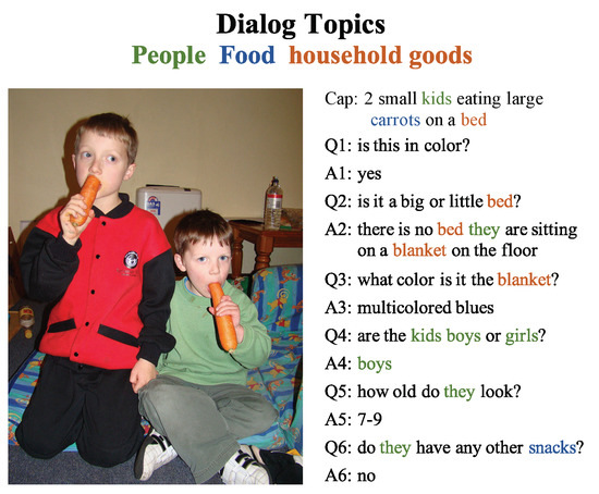 Example of a visual dialog task. The text color indicates the dialog topic (e.g., “people”, “food”, and “household goods”).