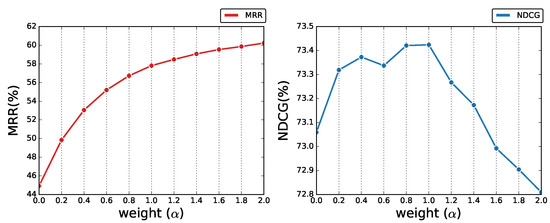Table 3 reports the results of fine-tuning on dense annotations. This fine-tuning on relevance scores for each candidate answer significantly boosts the performance of NDCG. However, existing works [17,18,21,22,24] show that the performance of non-NDCG metrics deteriorates in contrast to the case of NDCG. To alleviate the inconsistency between NDCG and non-NDCG metrics, we fine-tune the model with the joint loss (see Equation (Section 3.3.4)). Figure 3 shows the performance change of MRR and NDCG by varying , which is the weight of the discriminative loss, from 0 to 2. As increases from 0 to 1, MRR is rapidly improved while NDCG remained high. On the contrary, NDCG sharply decreases with small improvement in MRR when increases from 1 to 2. Based on this observation, we set to 1 and obtain significant improvements across two metrics. In the baseline comparisons, our MVAN model is ranked first in MRR regardless of whether it is a single or ensemble model (single: 56.06, ensemble: 65.16). In addition, MVAN is ranked first and second in AVG for single and ensemble model comparison, respectively, despite a little lower NDCG.