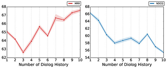 We experimented with the amount of dialog history to evaluate the impact of dialog history on the model performance of the two major metrics (i.e., MRR and NDCG). The results in Figure 4 are the average of the MRR and NDCG performance for each dialog turn in the validation set and show that as the amount of dialog history information increases, the MRR tends to gradually improve, but the NDCG score deteriorates. This quantity analysis shows that history information decreases the NDCG score but substantially boosts the other metrics.