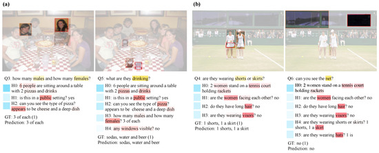 As shown in Figure 5a, comparing two examples, we see that the model no longer focuses on “6” and “people” in H0 because those words are not related to the topic of the current question (i.e.,“drinking”). In the example in Figure 5b, when answering Q4 (the left dialog), the model pays more attention to the question-relevant clue such as “women” in H0, while no longer focusing on it when answering Q6 (the question topic changes from “tennis outfits” to “background”). These qualitative results show that our model successfully pays attention to visual and textual information connected to the semantic intent of the question.