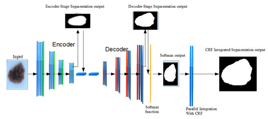 - Luo, W.; Yang, M. Fast skin lesion segmentation via fully convolutional network with residual architecture and CRF. In Proceedings of the 2018 24th International Conference on Pattern Recognition (ICPR), Beijing, China, 20–24 August 2018; pp. 1438–1443. [Google Scholar]