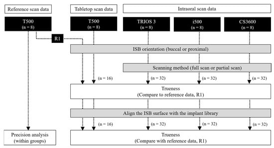 The purpose of the present study was to compare the trueness of digital implant impressions in a single implant case according to two variables: the ISB orientation and the scanning method. This was achieved by evaluating prealignment data containing the ISB on the virtual model, and postalignment data containing a virtual abutment reconstructed using the implant library. The first null hypothesis was that the trueness of prealignment and postalignment data obtained by the intraoral scanner is not affected by the type of intraoral scanner, ISB orientation, or scanning method. The second null hypothesis was that the trueness of prealignment and postalignment data obtained by a laboratory scanner is not affected by the ISB orientation.