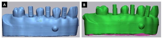 All scanners were calibrated according to the manufacturer’s instructions prior to starting the scans, and then the following experimental procedure was performed: The ISBs were connected to the fixtures at a torque of 15 Ncm and oriented so that their flat surfaces faced in the buccal direction (Figure 2A). The teeth were scanned first, and then the ISB portions were scanned. Scanning using the tabletop scanner was performed in the automatic scan mode provided by the equipment’s own software (n = 8), while that using the intraoral scanners was performed over the entire area (n = 8) or only a partial area (n = 8). Scanning the entire areas of the ISBs involved scanning all sides of the ISBs without any gaps, whereas scanning under the partial-area condition was performed mainly on the buccal and lingual surfaces. The connection direction of the ISBs was then changed so that their flat surfaces faced the proximal direction (Figure 2B), and the same scanning procedure was repeated. Each set of prealignment data was then converted into postalignment data containing the virtual implants and the abutments.