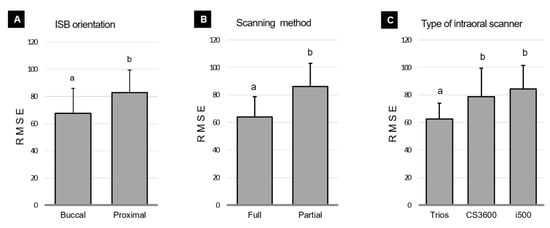 For the prealignment data, the overall RMSE was significantly lower in the buccal group than in the proximal group for the three intraoral scanners. Deep, undercut, angled, inclined, or crowded surfaces of surrounding structures are difficult to scan and hence cause inaccurate point clouds, which may decrease the scan accuracy in proximal areas [28,29]. This difference in ease of scanning between the buccal and proximal surfaces would have influenced the trueness according to the ISB orientation.