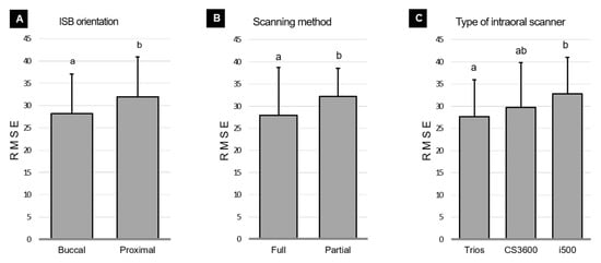Overall trueness in the postalignment data according to (A) ISB orientation, (B) scanning method, and (C) type of intraoral scanner. Data are mean and SD values. Different letters indicate significant differences.