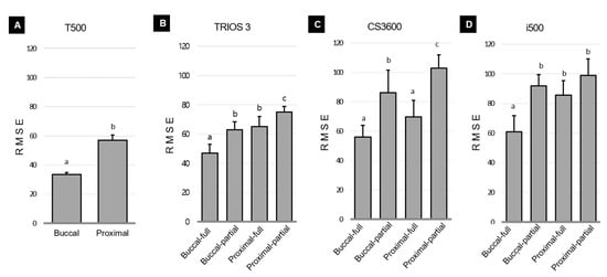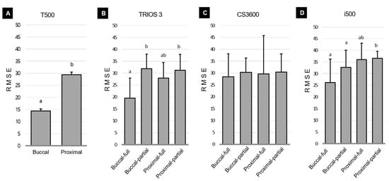 Postalignment data on trueness according to combinations of the ISB orientation and scanning method for each scanner are shown in Figure 6. For the T500 scanner, the RMSE was lower in the buccal groups (14.34 ± 0.89 μm) than in the proximal groups (29.35 ± 1.15 μm, p < 0.001). The TRIOS 3 scanner showed significant differences in one-way analysis according to the ISB orientation and scanning method (F = 5.342, p < 0.005), with the RMSE being lower for buccal–full (19.45 ± 8.42 μm) than for buccal–partial (31.89 ± 6.07 μm) and proximal–partial (31.20 ± 6.70 μm). For the CS3600 scanner, the RMSE values did not differ between the groups (F = 0.059, p = 0.981). The i500 scanner showed significant differences in one-way analysis (F = 3.369, p = 0.032), with the RMSE being lower for buccal–full (26.18 ± 10.11 μm) and buccal–partial (32.69 ± 7.31 μm) than for proximal–partial (36.54 ± 3.08 μm).