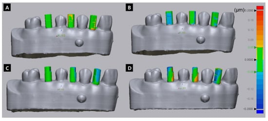 The postalignment data in which the virtual abutments were created by aligning using the implant library, and the trueness was evaluated by superimposing the reference scan data and extracting the abutment areas. The deviation tended to be lower in the buccal groups than in the proximal groups, and lower in the full-scan groups than in the partial-scan groups. The deviation tended to decrease relative to the prealignment data: (A) buccal–full group, (B) buccal–partial group, (C) proximal–full group, and (D) proximal–partial group.