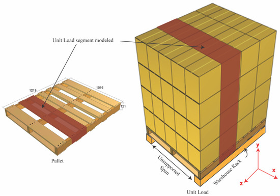 The structure of the paper is as follows: in Section 2, a common unit load representation is described and the simplifications and assumptions for modeling are detailed. In Section 3, a two-dimensional finite element model of the unit load segment is established. All the model information for accurate replication is provided. In Section 4, the materials and methods for the experimental validation are presented. The model validation is conducted in two major steps. First, the pallet support and the board are validated, followed by the validation of the unit load segment, including multiple different payloads. In Section 5, the results of the model validation are presented. A discussion on the agreement of the physical representation and the finite element model is provided. Section 6 presents the main conclusions of the investigation.