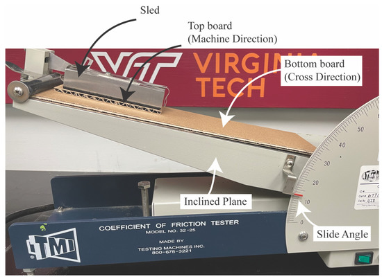 In order to model the contact properties of the unit load segment, the static friction coefficients between the different components were measured. The coefficient of friction was measured for each of the contacts identified (Figure 2). The frictional values for the corrugated fiberboard were measured before the was converted into boxes. All coefficient of friction values were obtained following the slide angle method from the industry standard TAPPI T-815 (2018). This test method was used to evaluate the specific material’s properties and ignore any additional variations that might be present when boxes are fully converted. Figure 2 shows the location of the contacts for the horizontal, vertical and pallet frictions. Friction coefficients were measured for each of the identified contacts and the corresponding alignment of the fluting structures. Horizontal box to box contact was measured as the contact between both boards along the machine direction. Vertical contact was measured as cross direction for both specimens. The payload contact with the pallet was evaluated with the corrugated board aligned along the machine direction, given the direction of box movement along the X-axis. Table 3 shows the coefficients of friction for each contact interaction. Experimental measurements of the coefficients of friction were replicated 10 times for each contact, reducing the commonly occurring variability in frictional forces on natural materials. Figure 3 shows the experimental test setup for the determination of the coefficients of friction of each of the identified contact interactions. For simplicity, the friction corresponding to the horizontal contact between boxes will be referred to as horizontal friction, the vertical contact between boxes as vertical friction, and the contact between the pallet and the payload simply as pallet friction. All measurements were conducted under standard laboratory conditions (50% relative humidity ± 2%; 23 ± 1 °C).