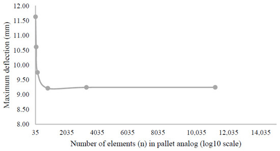 Pallet simulator mesh convergence results for 3 columns, 3-layer unit load. Maximum pallet deflection (U2, mm) at the board midspan versus total number of elements.