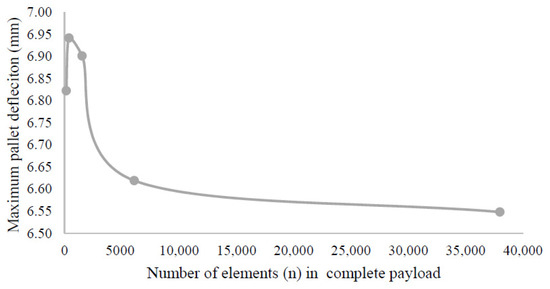 In order to arrive at the optimal number of elements for the pallet analog, a mesh convergence study was conducted for a unit load consisting of three columns of three layers of boxes. The goal was to select the ideal seed size for each mesh element that would converge the results into a stable value without unnecessarily increasing the number of equations needing to be solved. An element size of 2.54 mm provided that ideal size. Coarser meshes associated with larger elements reduced calculation time but impacted the deflection results. Finer meshes defined by smaller element sizes provided solutions with almost the same values but increased exponentially the computing requirements. When decreasing the element size from 2.54 mm to 1.27 mm, the resulting change was less than 1%, but it increased 2.5 times the computing requirements, generating 11,200 elements compared to 3200. The percentage difference due to change in vertical displacement was calculated by dividing the difference in vertical displacement by the vertical displacement of the previous simulation. Table 4 and Figure 4 show the summary of the results obtained from the mesh refinement and convergence studies.