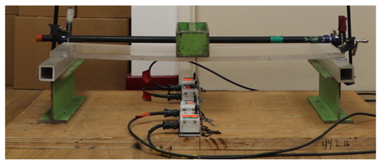 While the pallet simulator was being loaded, it was supported from underneath using two car jacks. This was done to avoid any additional bending of the pallet during the loading of the payload. The removal of the car jack supports was done at a slow rate, manually lowering the supports until they had no further contact with the board. Maximum deflection at board midspan was recorded one minute after the supports were removed. All measurements were conducted under standard laboratory conditions (50 ± 2% Relative Humidity and 23 ± 1 °C), and every material that was used had been acclimated to those conditions for at least 72 h. Figure 7 shows the experimental test setup for the warehouse racking support simulator.