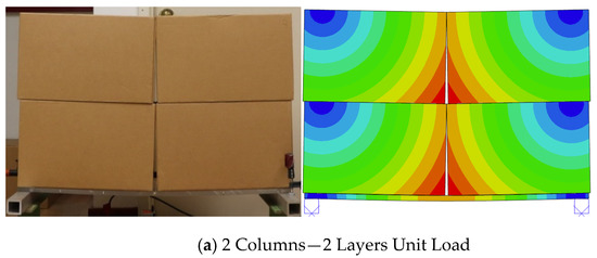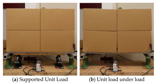 Unit loads with different configurations were developed to measure the bending moment response of the pallet. Different configurations were achieved by changing the unit load’s main variables such as the number of columns, number of layers, and the total weight supported by the pallet. It is known from previous experimental research that these factors are the ones generating the main effects on load bridging [4,15,19,20,23]. Representing a wider range of unit loads during the experimental studies allows for more robust model validation afterwards. The number of layers and total weight of each unit load evaluated are shown in Table 9. Each test was replicated five times. Figure 8 shows an example of a loaded unit load segment of two columns and two layers, supported to prevent bending while under deflection. To simplify the identification of the unit loads, a notation of “columns × layers” will be used; a unit load composed of four columns and three layers will be referred as a 4 × 3 unit load.