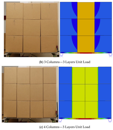 Comparison of movement of unit load components under deflection for experimental (left) and finite element analysis (right) for two layers and (a) two columns, (b) three columns, and (c) four columns of packages. Images shown for the model (left) are colored based on deflection. Red equals large displacements, blue represents no movement.
