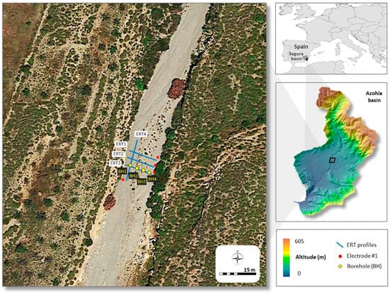 This study was carried out in an upper stretch of the ephemeral gravel-bed channel known as “Rambla de la Azohía”. The Rambla de la Azohía is located in the Murcia Region, in southeastern Spain (Figure 1). The climate of the study area has strong seasonal contrasts, providing extreme drought patterns with mean annual precipitation values of 300 mm, and ETP values higher than 140 mm per month in the summer season. The rains are very irregular and intense, which can cause large and rapid floods [10]. The land cover shows a low anthropic impact, associated with extensive scrub areas with shrub canopy typically lower than 20% of total vegetation.
