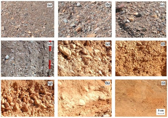 Sediment texture observed on the surface ((a): active channel, (b): transition area between active channel and central alluvial bar, (c): central bar platform) and in the depth of the trench sections ((d): sub-surface layer 1 m deep in the active channel area, (e–h): sub-surface layers 1–1.5 m thick from top to bottom in a bar sedimentary sequence), and (i): representative texture of the alluvial fan body cut by the Rambla de la Azohía in its upper reach.