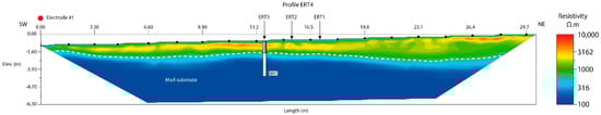 ERT4 profile used 56 stainless steel electrodes with a spacing of 0.55 m and a length of 30.25 m. ERT1, ERT2, and ERT3 profiles used 28 stainless steel electrodes with a spacing of 0.55 m and a length of 14.85 m. The investigation depth was ≈6 and 3 m, respectively. Additionally, each electrode was suitably georeferenced using a Leica Zeno 20 GPS equipment (accuracy of ±1 cm) from Leica (Barcelona, Spain).