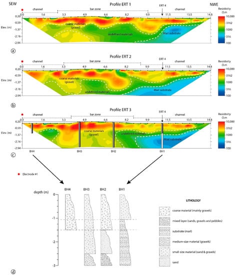Besides, the profiles ERT1–ERT3 identified the marl substrate featured with lower resistivity values (blue-cyan in the colour bar), which confirms the results obtained from the ERT4 profile. The 2D ERT study reproduced the physical structure of the channel, it presented a central bar and two lateral channels. ERT1 was in the upstream while ERT3 was in the downstream direction. This distribution allowed us to identify the bar geometry, which is wider in ERT1 but narrower in ERT3. The bar presents a triangular form, indicating that the bar decreases in the downstream direction. Four mechanical boreholes were drilled on ERT3 (Figure 4).
