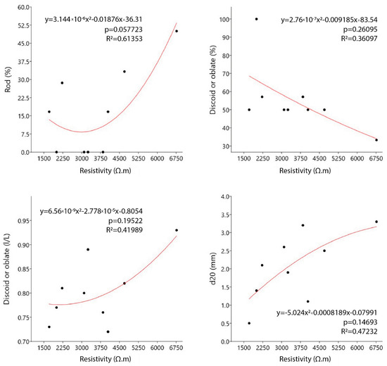 Following these correlations, we perform a regression analysis. Figure 5 shows the four regression models obtained. Rod (%), Discoid (I/L), and D20 (mm) present a direct relationship with the resistivity. While one variable increases, the other variable has the same behaviour. Discoid (%) presents an indirect relationship with resistivity, which means that while the resistivity rises, the discoid variable reduces.