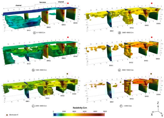 Figure 6c–f, with values of resistivity >2000 Ω.m, represent the layer 1 to 1.5 m thick, which is common in all boreholes, except in BH2, composed mainly of medium and coarse gravels. The layer disposition in the 3D model adopts an onion-like shape, finding the least resistivity values in the external part and the most resistant in the core. Values of resistivity ranging from 2000 to 3000 Ω.m (Figure 6c) are linked to the green-yellow colour, forming a layer in the model that constrains in the lateral direction of the bar by 6–8 m, acquiring a shell form at the bottom of the model.