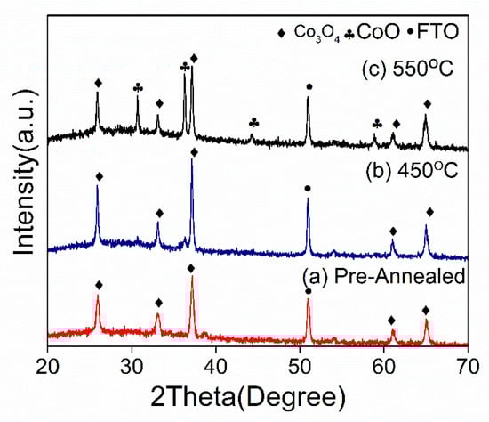 - Martínez-Gil, M.; Cabrera-German, D.; Pintor-Monroy, M.; García-Valenzuela, J.; Cota-Leal, M.; De la Cruz, W.; Quevedo-Lopez, M.; Pérez-Salas, R.; Sotelo-Lerma, M. Effect of annealing temperature on the thermal transformation to cobalt oxide of thin films obtained via chemical solution deposition. Mater. Sci. Semicond. Process. 2020, 107, 104825. [Google Scholar] [CrossRef]