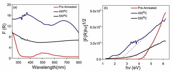 - Chen, G.; Lu, B.; Cui, X.; Xiao, J. Effects of Deposition and Annealing Temperature on the Structure and Optical Band Gap of MoS2 Films. Materials 2020, 13, 5515. [Google Scholar] [CrossRef] [PubMed]